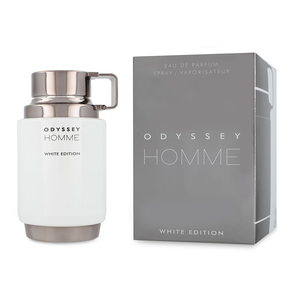 Odyssey Homme White Edition de Armaf es una fragancia de la familia olfativa ámbar fougère para hombres. Las notas de salida son pimienta rosa, toronja (pomelo) y yuzu; las notas de corazón son hojas de violeta y notas marinas; las notas de fondo son ámbar, Amberwood y madera de gaiac.